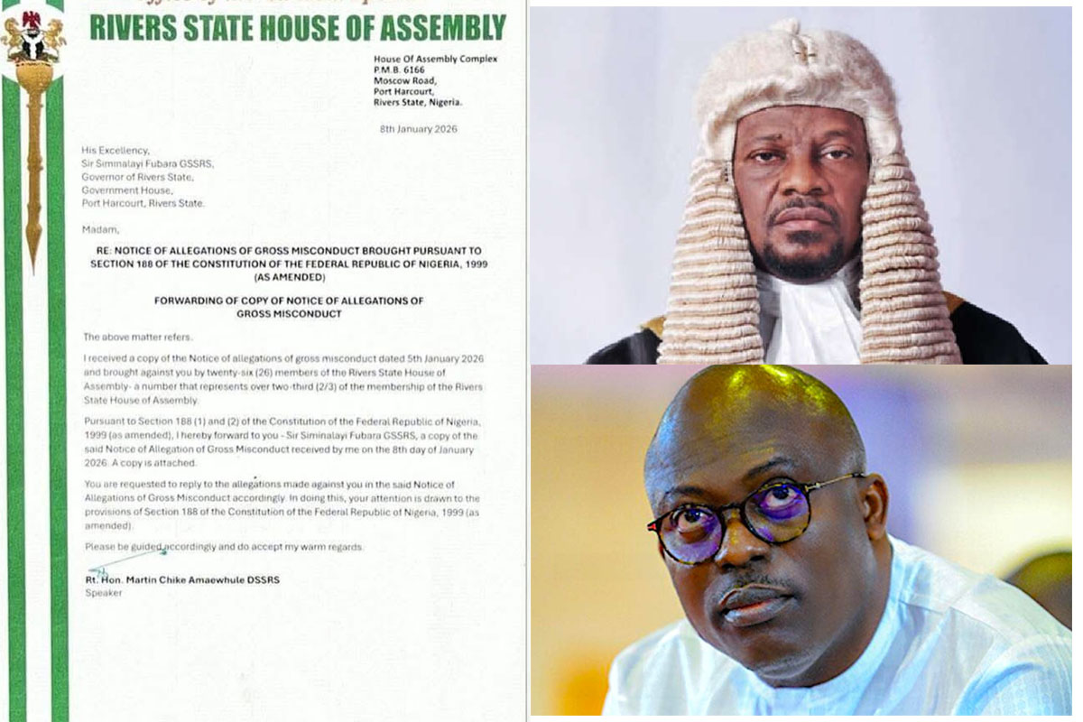 The notice, dated January 8, 2026, was eventually served on Governor Fubara but controversially addressed him as “madam.” The letter, signed by Amaewhule, stated that the impeachment process was initiated pursuant to Section 188 of the 1999 Constitution (as amended), which outlines the procedure for the removal of a governor.