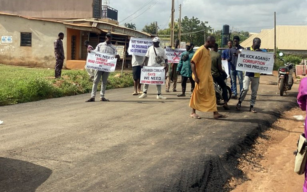 Carrying placards with messages such as “We say no to no drainage and stonebase road,” “We need a quality road in Aduramigba,” and “We kick against corruption on this project,” the protesters demanded immediate intervention.